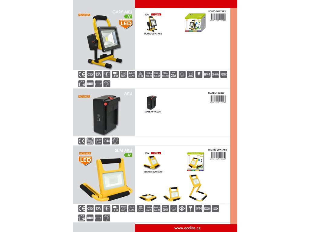 LED reflektor GARY AKU s typovým označením RC020-20W/AKU se vyznačuje vysokou přenosností díky praktickém stojanu a madlu. Reflektor disponuje lithiovou baterií (4x 2,2Ah / 8,4V), která se ve 3 módech výkonnosti postará až o 12 hodin nepřetržitého provozu. Baterie MATBAT-RC020 je samostatně prodejná položka, kterou lze pořídit do zálohy. GARY nahrazuje klasické halogenové reflektory, které mají často až 10x vyšší spotřebu a pomalý náběh. O úsporný chod se stará vysoce účinný a moderní čip typu COB. Reflektor je v celokovovém provedení s bezpečnostním sklem a díky vysokému krytí IP44 najde uplatnění i venku při osvětlování staveb, dílen nebo budov.Doplňkové parametry