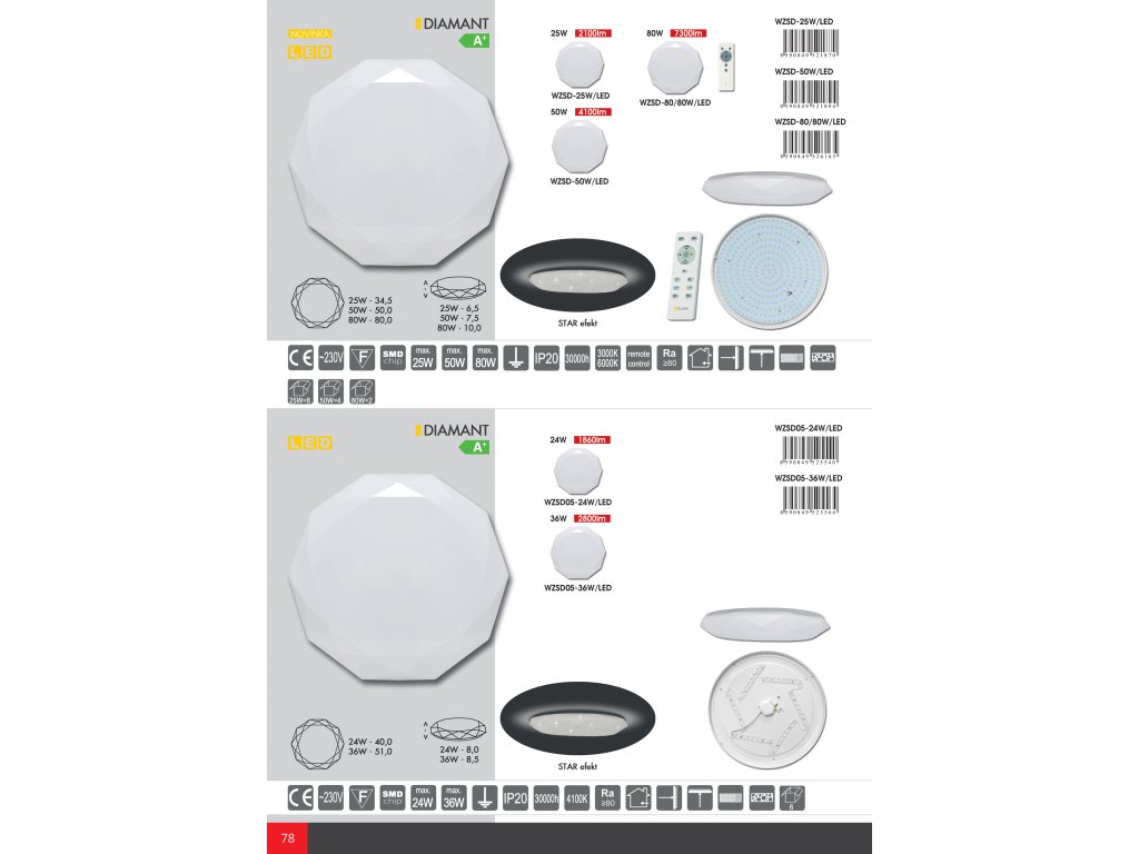 Moderní stropní svítidlo DIAMANT s typovým označením WZSD05 je jednodušší varianta modelu WZSD bez dálkového ovládání a možnosti regulace teploty chromatičnosti. Využívá vysoce úspornou LED SMD technologii. Příznačný název svítidla charakterizuje především kryt, který svým povrchem s facetami po okraji připomíná drahokam. Díky miniaturním čirým ploškám je docíleno třpytivého "STAR" efektu, který svítidlu dodává eleganci a půvab.Tabulka hodnot
