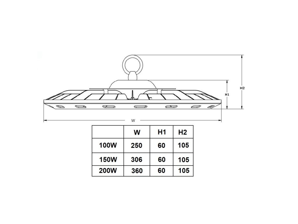 100W LED průmyslové svítidlo typu "High Bay", kterým lze nahradit průmyslové osvětlení ve skladech, průmyslových halách, fabrikách a dalších průmyslových objektech nebo jiných nemovitostí. Za původní sodíkové osvětleníSpecifikace LED UFO 100W | ||