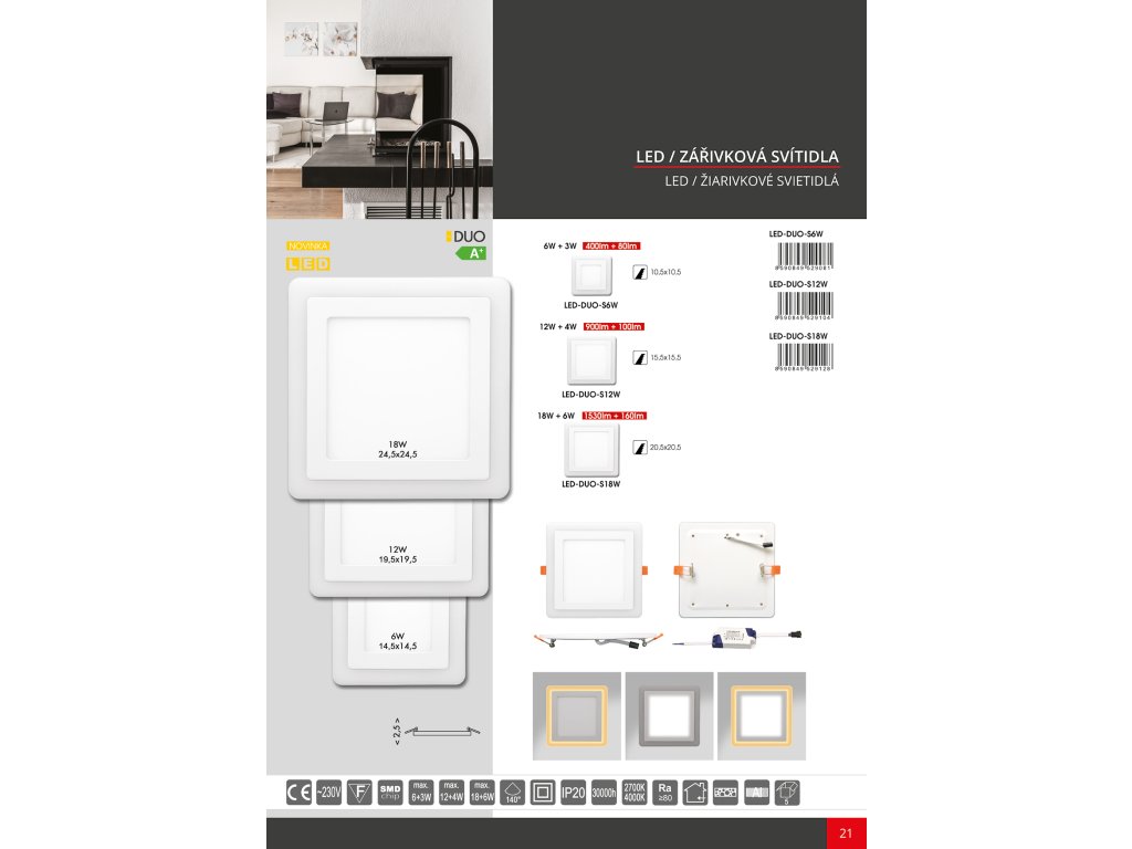 Serie DUO přináší oproti běžným vestavným svítidlům komfort a svobodu ve volbě teploty chromatičnosti, čehož je docíleno pomocí 2 typů vysoce úsporných LED SMD čipů s teplotou 2700 a 4000K. Přepínání mezi teplotami se provádí pomocí běžného nástěnného vypínače, kterým nastavíte vždy jeden ze 3 módů: dekorativní vnější prstenec (2700K) / vnitřní kruh (4000K) / obojí (2700+4000K). Tělo svítidla je vyrobeno z litého hliníku a kryt z plastu. Milovníky hranatých tvarů potěší model S, nabízíme ale i kruhovou verzi R. Instalace se provádí pomocí klasických pružinových úchytů a napájecí zdroj (driver) je součástí balení.Doplňkové parametry