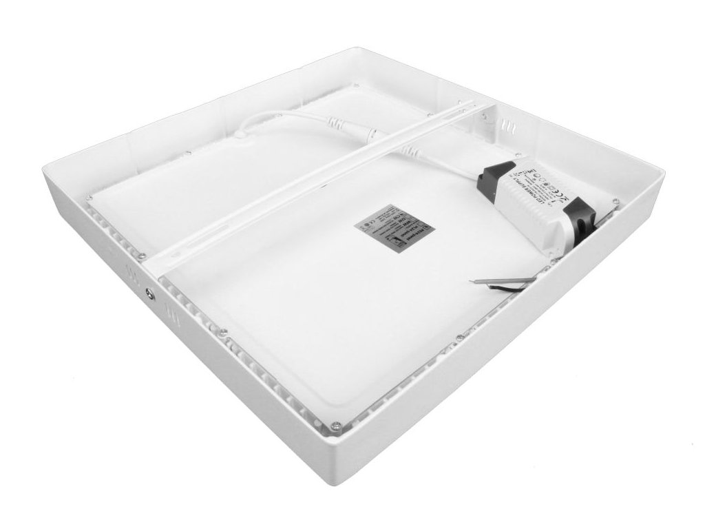 Čtvercový přisazený LED panel 24W. Díky bočnímu nasvětlování nejsou jednotlivé LEDky při rozsvícení viditelné a lze použít i ultratenký design.