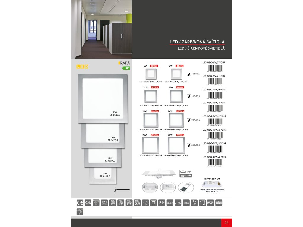 Stylové vestavné svítidlo s moderní a vysoce úspornou SMD LED technologií (2835), které lze díky pružinovému úchytu snadno nainstalovat např. do sádrokartonu, je vyrobeno z litého hliníku a plastu. Na výběr je několik velikostí s odpovídajícím výkonem 6/12/18/25W a teplotou 2700/4100K. Milovníky hranatých tvarů potěší model RAFA, nabízíme ale i kulatou verzi LADA. Napájecí zdroj (driver) je součástí balení.Doplňkové parametry