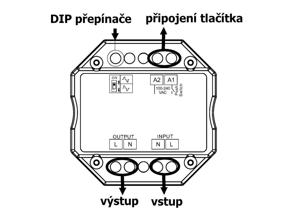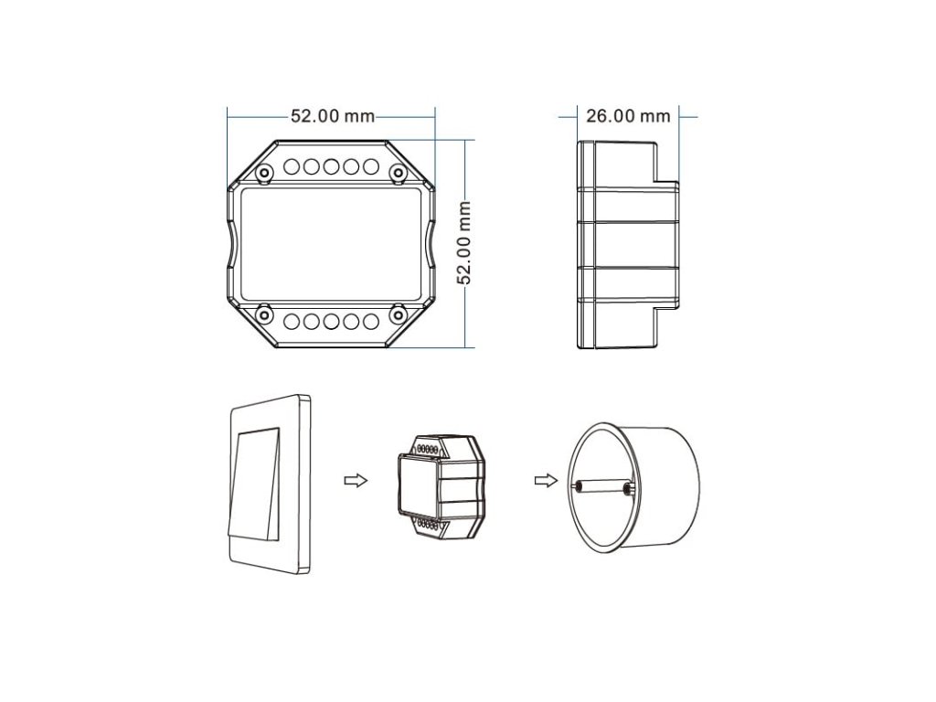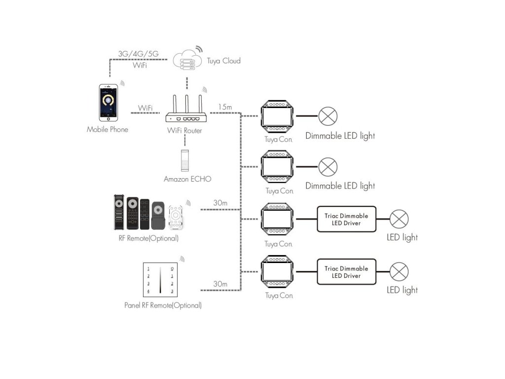 Přijímač je kompatibilní se všemi ovladači řady dimLED, aplikací Tuya, Amazon Alexa (ECHO) a zároveň má přijímač svorkovnici pro připojení tlačítka, kterým lze přijímač manuálně ovládat.