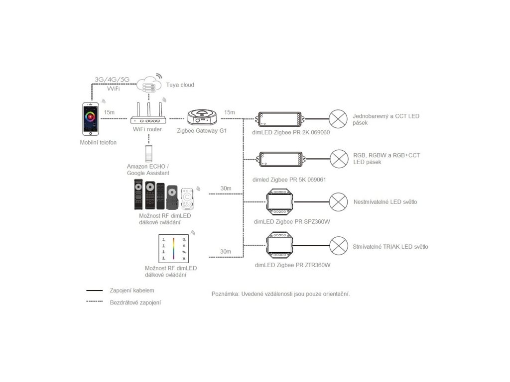 | Přenosový sígnál | ZigBee 3.0, RF 2.4G pro dimLED ovladače | ||