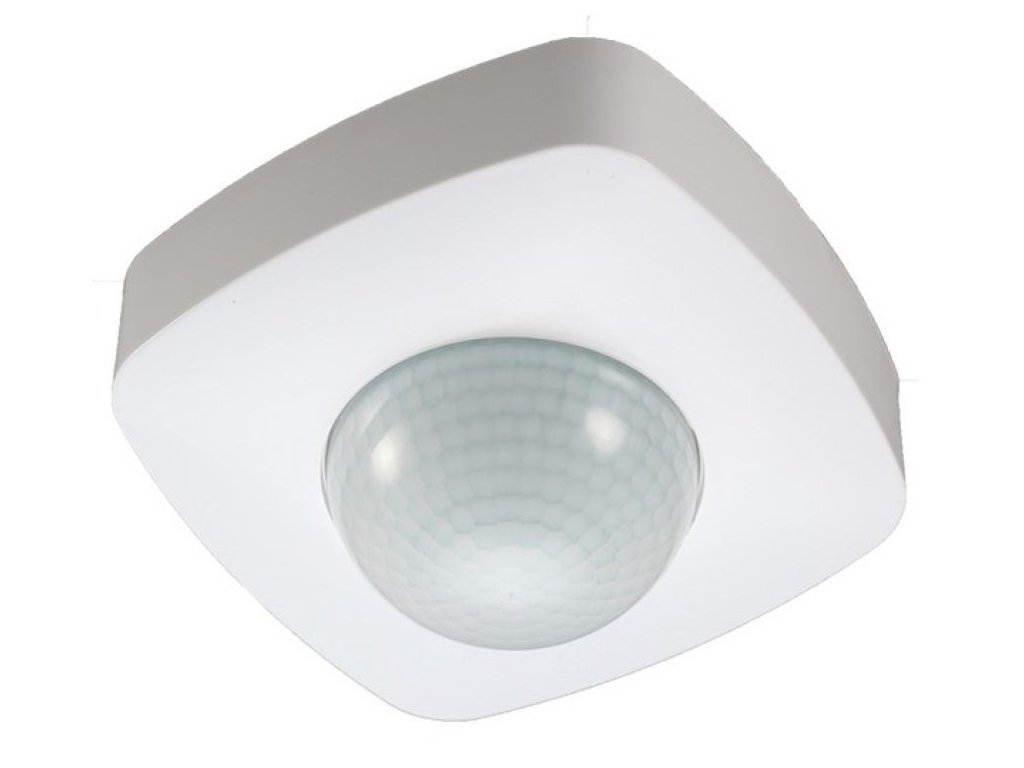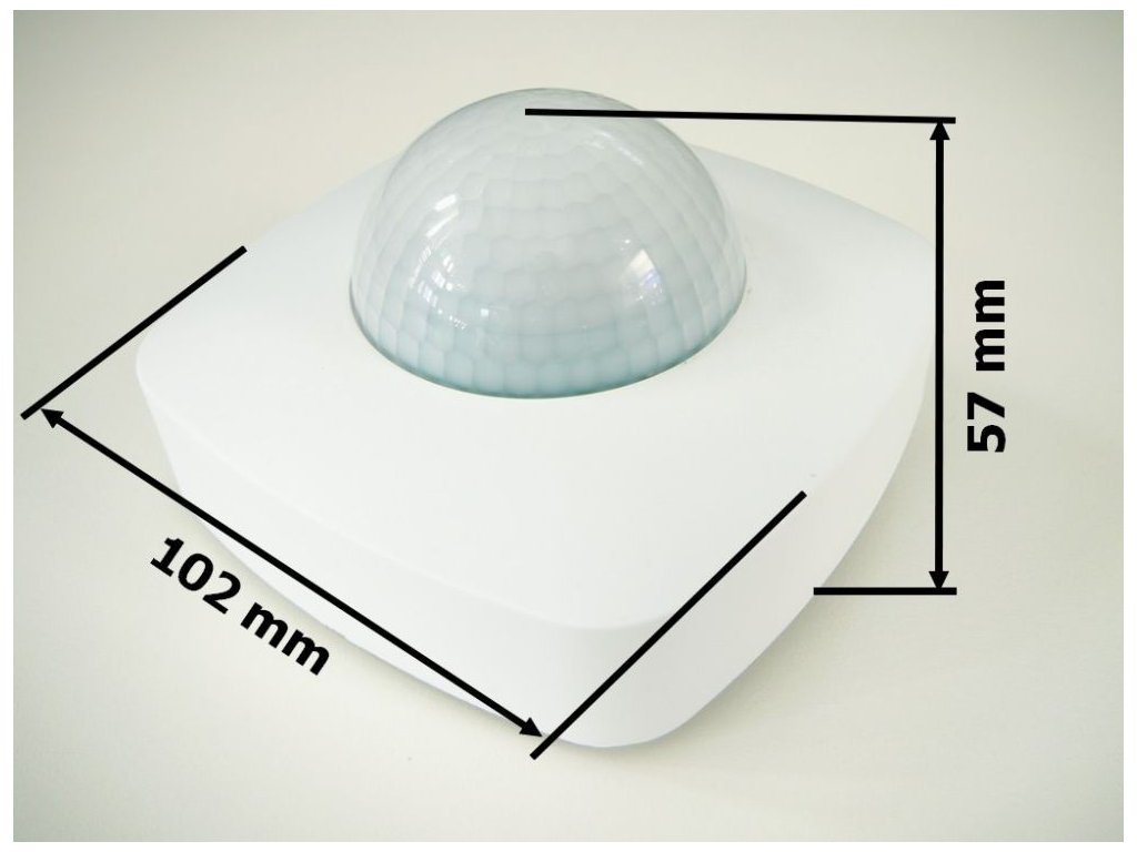 Infračervené čidlo s detektorem přítomnosti a dosahem až 20m, snímané pole čidla je kruhové, 360°, maximální vertikální úhel dosahu čidla pohybu je 160°