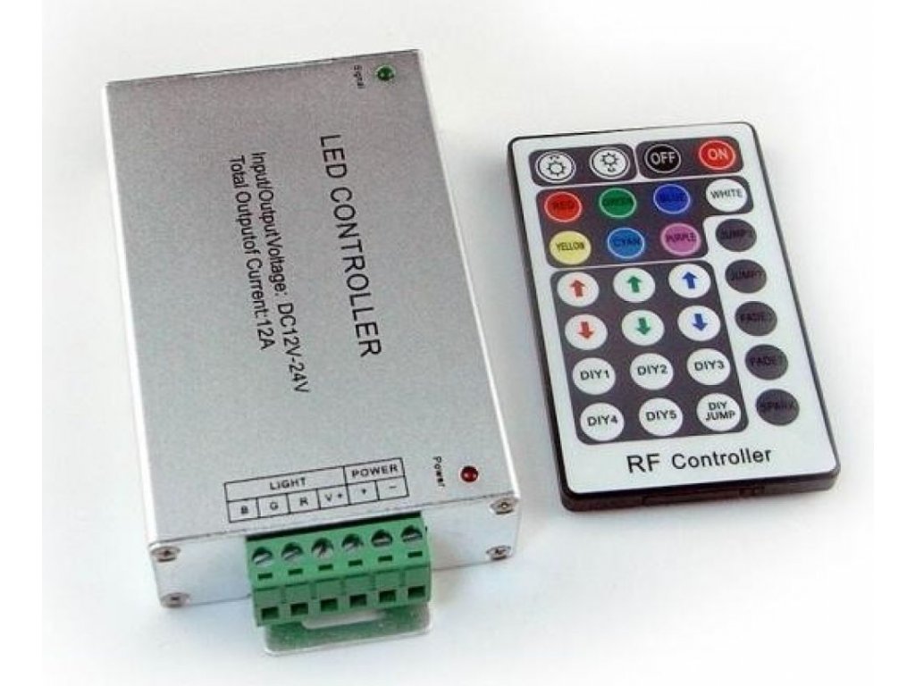 Programovatelný ovladač pro RGB LED pásky - RF (radiofrekvenční ovládání) umožňuje dálkově ovládat intensitu jasu, nastavení barev, barevných přechodů a jejich rychlost u RGB LED pásků a modulů. Přijímač může být ukrytý (za zdí, sádrokartónem či ve skříni), není nutná přímá viditelnost přijímače pro ovladač.