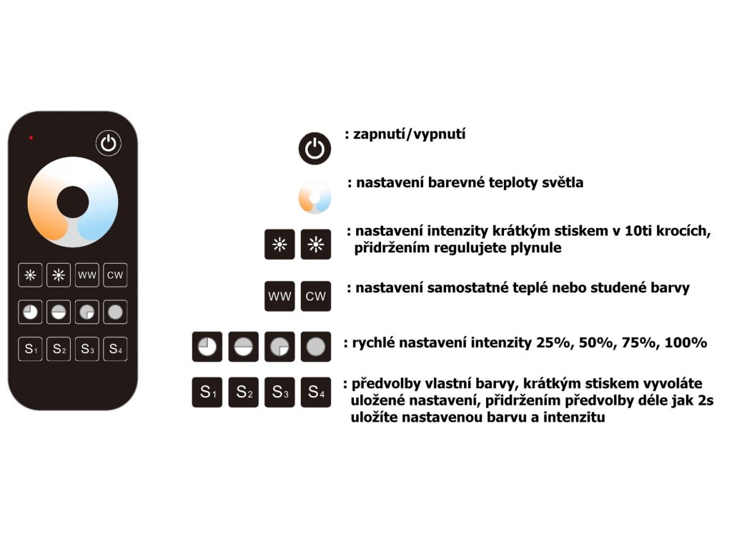 Dálkový ovladač dimLED OVM CCT 1KRM je bezdrátový radiofrekvenční ovládací systém, jednoho ovladače a několik přijímačů. S jedním ovladačem lze ovládat 1 zónu, která se může skládat z několika přijímačů. Tyto přijímače se po sehrání s ovladačem ovládají jako jedna sekce.