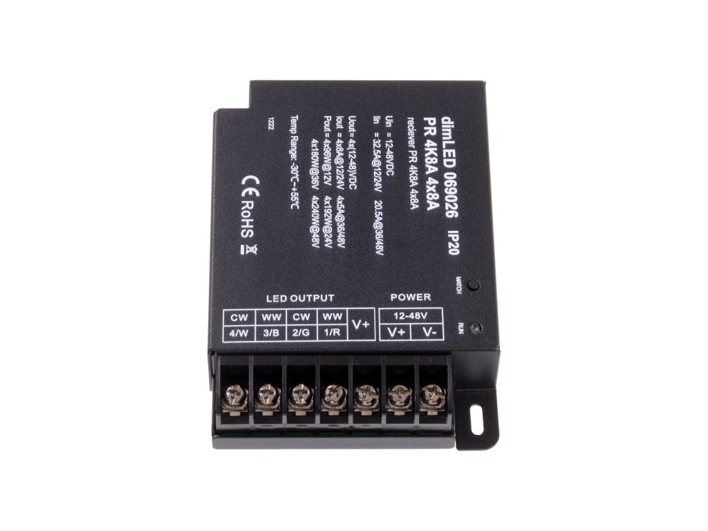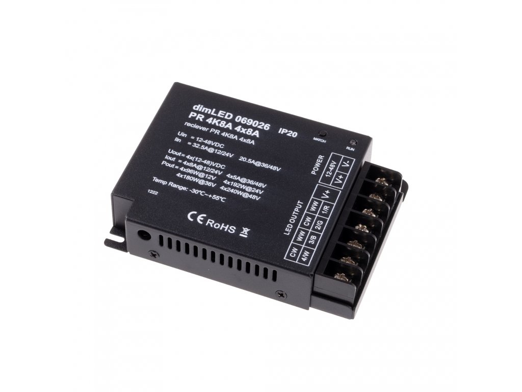 Radiofrekvenční stmívač a přijímač pro jednobarevné, CCT, RGB a RGBW LED pásky a jiné LED produkty na napětí 12-48 VDC. Přijímač může být ukrytý (za zdí, sádrokartónem či ve skříni), není nutná přímá viditelnost přijímače pro ovladač. Lze také ovládat i různými druhy dálkových ovladačů řady dimLED z naší nabídky, kterými můžete zároveň ovládat i jiné přijímače dimLED. Přijímač je také kompatibilní se všemi ovladači dimLED 2,4GHz ALLMIX. Vše tedy poté můžete řídit jedním ovladačem a nemusíte mít poté například na LED pásky a žárovky 2 různé ovladače. Na každý přijímač lze napárovat až 10 různých ovladačů řady dimLED a tak ovládat z několika míst. Pro ovládání více okruhů je nutno použít jeden přijímač na každý okruh.