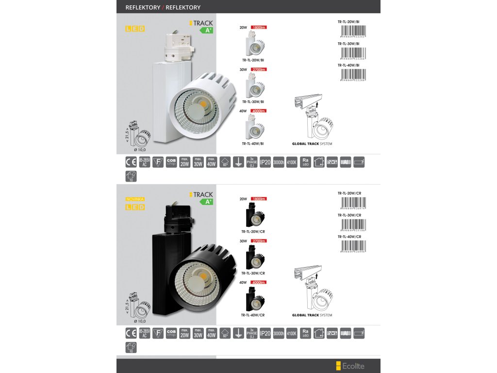 Designový LED reflektor TR-TL je třífázové svítidlo pro uchycení na lištový systém, který lze sestavit na míru podle dispozic a účelu místnosti. Výrobek nabízíme ve výkonech 20, 30 a 40W a díky modernímu LED COB čipu se postará o úsporný chod a stabilní výkon v řádu desítek tisíc hodin. Produkt je vhodný jako bodové osvětlení interiéru v domácnosti, ale najde široké uplatnění v obchodních prostorách při nasvícení určité umělecké scény, regálů či prodejních pultů. Lišty jsou samostatně prodejné položky, nejsou součástí dodávky.Doplňkové parametry