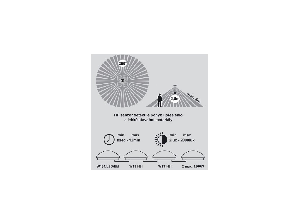 Senzor pohybu: HF čidlo pohybu funguje na principu mikrovln, které detekují pohyb i přes sklo a lehké stavební materiály.