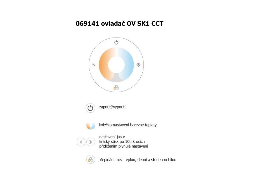 Dálkový ovladač dimLED OV SK1 S je bezdrátový radiofrekvenční ovládací systém, jednoho ovladače a několik přijímačů. Ovladač je určený pro ovládání CCT osvětlení jako jsou například CCT LED pásky nebo jiná CCT svítidla. S jedním ovladačem lze ovládat 1 zónu, která se může skládat z několika přijímačů. Tyto přijímače se po sehrání s ovladačem ovládají jako jedna sekce. Přijímač může být ukrytý (za zdí, sádrokartónem či ve skříni), není nutná přímá viditelnost přijímače pro ovladač.Vlastnosti a výhody systému dimLED: