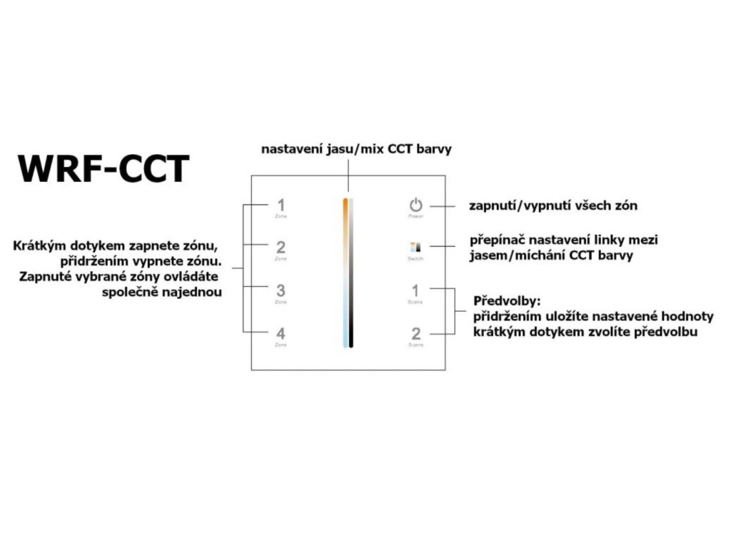Čtyřkanálový LED ovladač OV WRF-CCT pro CCT osvětlení je bezdrátový radiofrekvenční ovládací systém, jednoho ovladače a několik přijímačů. S jedním ovladačem lze ovládat nezávisle 4 zóny, která se může skládat z několika přijímačů. Tyto přijímače se po sehrání na jednotlivé předvolbě na ovladači ovládají jako jedna sekce.