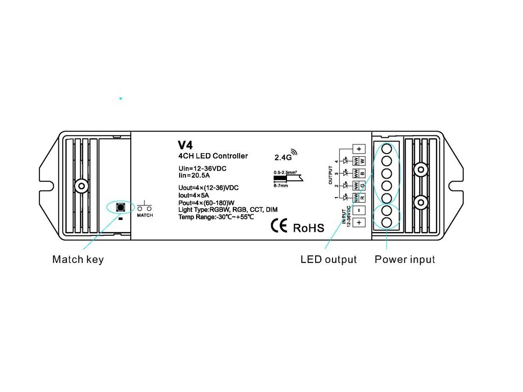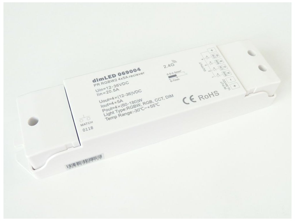 Radiofrekvenční přijímač stmívač pro RGBW LED produkty. Přijímač může být ukrytý (za zdí, sádrokartónem či ve skříni), není nutná přímá viditelnost přijímače pro ovladač.