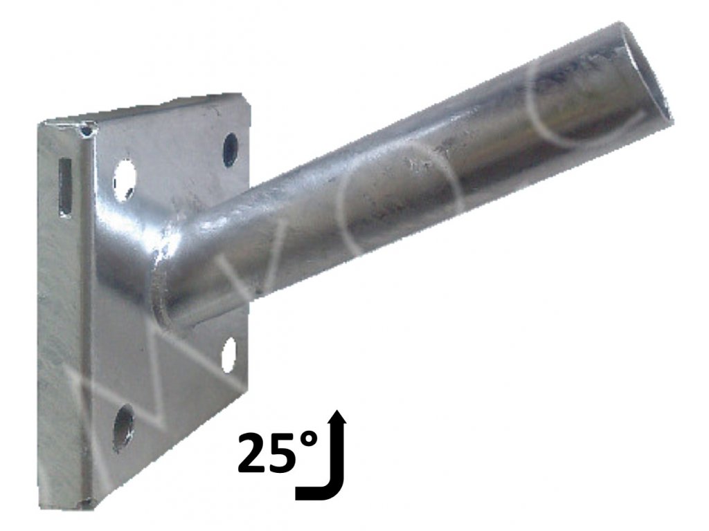Výložník slouží k upevnění lamp veřejného osvětlení. Výložník je pevný, úhel 25 stupňů, průměr 38mm. Délka 190mm. Hmotnost 0,7kg. Podstava 130 x 130mm. Průměr otvorů 15mm. Povrchově upraveno žárovým zinkem.