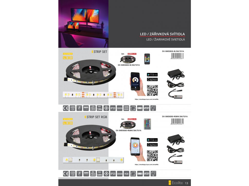 Tento chytrý RGB LED pásek lze ovládat jak pomocí přibaleného ovladače, tak i pomocí mobilního telefonu/tabletu s bezplatnou aplikací, kterou si můžete stáhnout pro systémy Android 5.0 a vyšší nebo iOS 10.0 a vyšší. WIFI modul se v rámci prvotního nastavení postará o propojení s vaší domácí bezdrátovou sítí a systém pak můžete ovládat odkudkoliv v rámci jejího dosahu, popř. i mimo domov pomocí mobilního připojení (tato funkčnost vyžaduje odborné nastavení síťových prvků). Kromě funkce stmívání lze díky RGB čipům zvolit jakokouliv barvu z RGB spektra podle aktuální potřeby a nálady. Výrobek je určen pouze pro interiéry a lze použít například pro osvětlení výloh, nábytku nebo pro nepřímé/ odražené osvětlení stropních podhledů a lišt. LED pásek doporučujeme nalepit na hliníkovou lištu pro efektivnější chlazení a delší životnost. Pásek je dělitelný po 5cm segmentech, takže lze podle potřeby upravit jeho délku.
