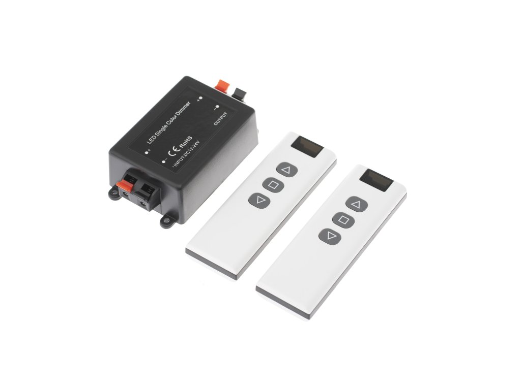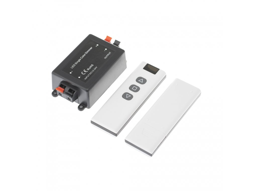 Stmívač a vypínač jednokanálový RF - radiofrekvenční dálkové ovládání intensity jasu LED pásků, stmívatelných LED žárovek 12V a jednobarevných modulů.Přijímač může být ukrytý (za zdí, sádrokartónem či ve skříni), není nutná přímá viditelnost přijímače pro ovladač.