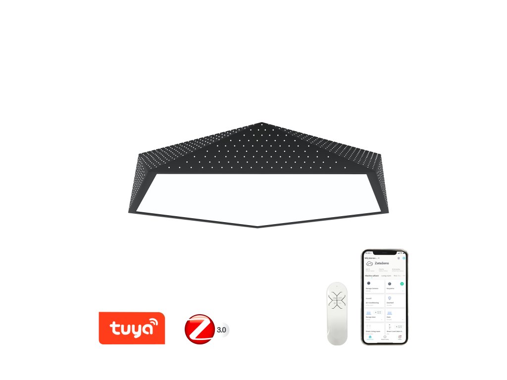 Stropní svítidlo BRILIANT v černém matu, novinka na trhu s chytrým osvětlením. Luxusní provedení lomených hran, drobné průsvity na bocích, stmívání, volba odstínu bílé barvy světla, Smart funkce a možnost výběru ze tří velikostí, svítidlo BRILIANT opravdu pokryje všechna očekávání náročného uživatele.